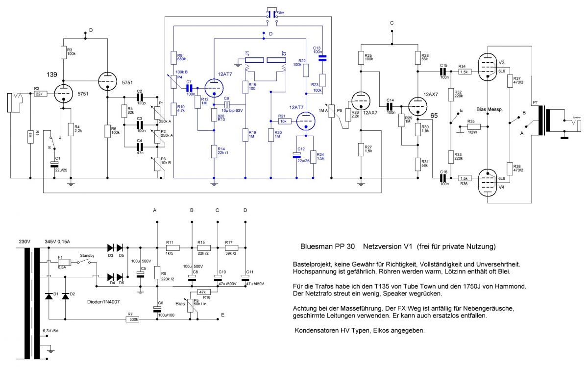 In die Entwicklung dieses Verstärkers ist viel Zeit und Aufwand geflossen. Es hat ein paar Jahre gedauert, die Schaltung ist nun ausgereift und wenn man sie mit einem der vielfältigen Fenderpläne der 50er Jahre vergleichen wollte, so käme man beim 15W am ehesten mit dem Princeton non Reverb (ähnlich auch dem Seydel Hyperamp I) hin, beim 30W halte ich den Pro 5e5A" für eine gute Basis.