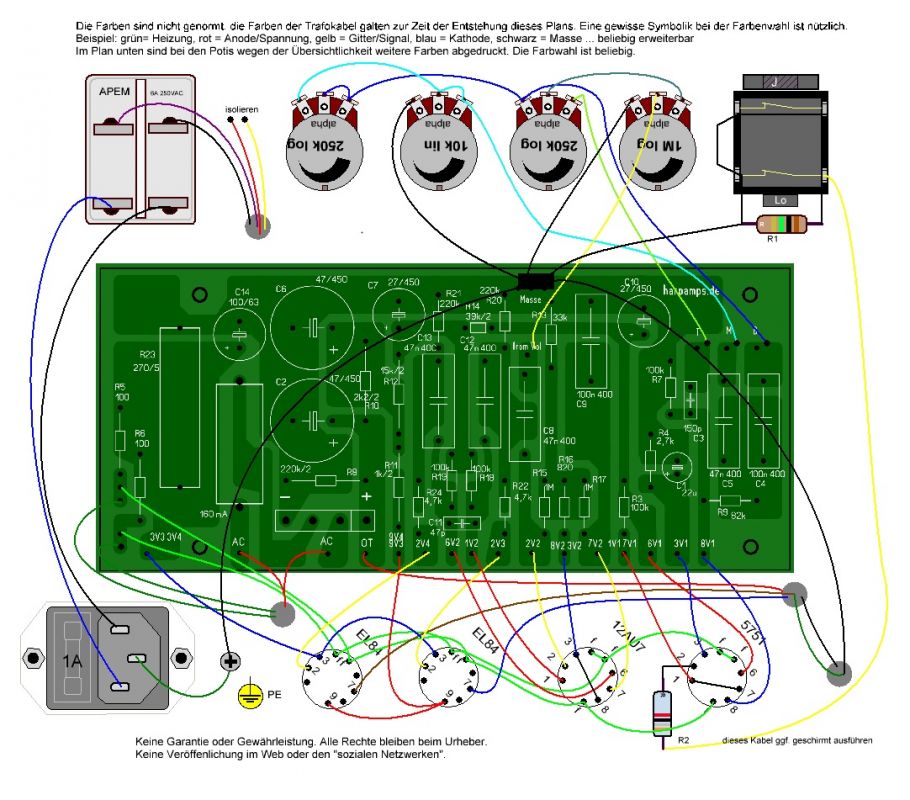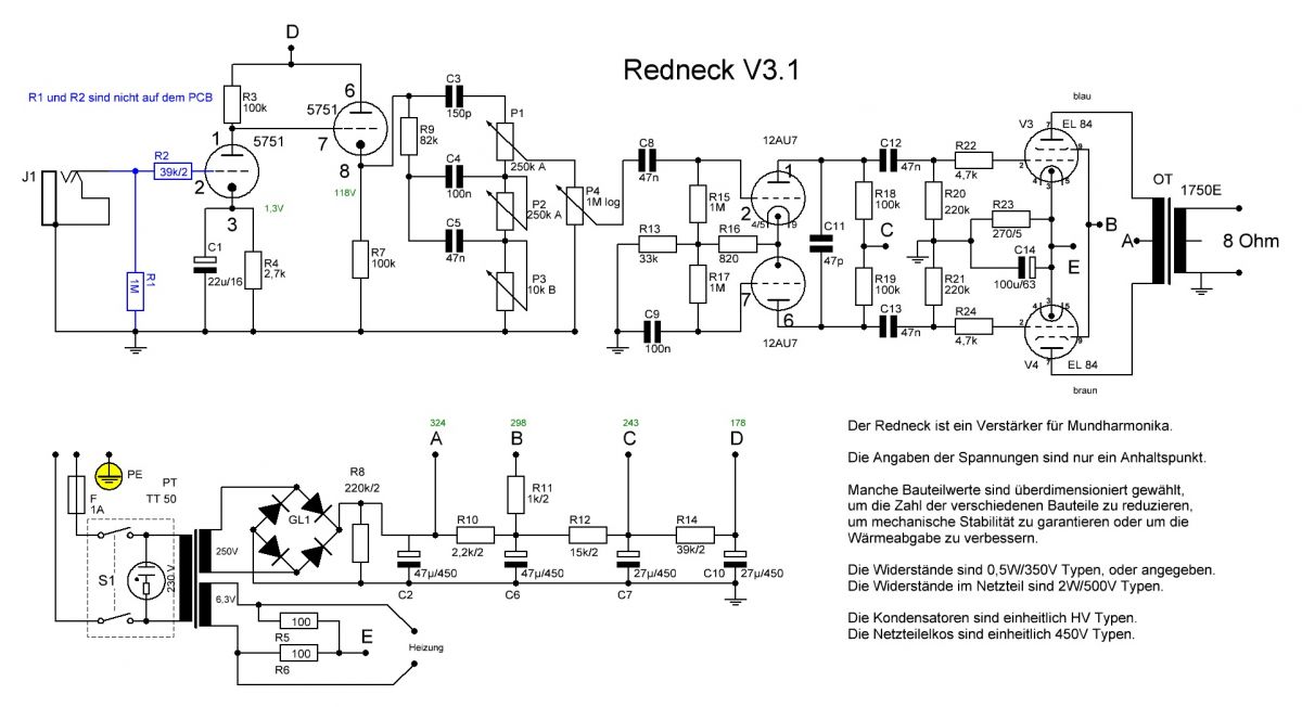 Für die Bastler angemerkt: Der Kathodenwiderstand der Endröhren ist in V3.0 (die erste online Version) den historischen Vorbildern mit 180 Ohm angelehnt. Damit befindet man sich aber je nach Röhren schon sehr im Grenzbereich. Im Plan V3.1 ist dieser Wert auf 270 Ohm erhöht worden. Der Amp bleibt kühler und man hat mehr AB Betrieb. Ggf. kann man noch eine Stufe höher auf 330 Ohm gehen. "drstrange" hat das mit Erfolg bei seinem Amp gemacht.