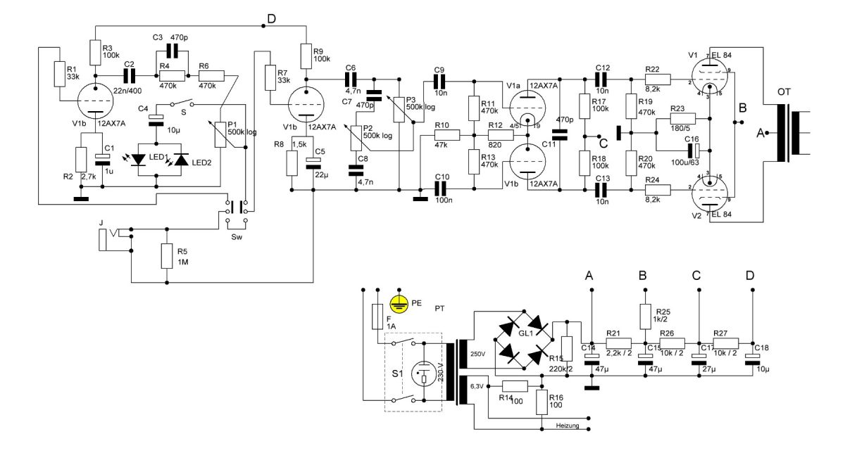 Der Greenie hat eine 2xEL84 Endstufe, die fast vollständig vom "18W" übernommen wurde. Der Biasstrom ist ein wenig geringer eingestellt. Die erste Triode kann man seriell schalten und es gibt noch eine Dioderzerre. So hat man am Drehschalter 3 Soundvarianten.