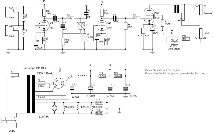 The last version had the GB12 speaker, a custom tone control and "very low bias". Then, I gave up the circuit. It was only a very expensive and pointless heavy "Poor Bluesman" with 6L6. See the diagram on the right. Shortly thereafter, the "Triple Power" was born and became kind of a "Rent-an-Amp" thing in Frankfurt. By the way: whoever owns it these days, send it back ... there are updates, that's for sure.