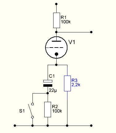 The cathode e-cap can become switchable, whereby you have two usable gain levels. The picture shows the luxury version with a resistor which prevents cracking noises.